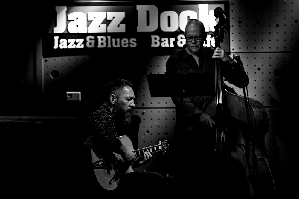 Without any further ado only to the smooth sounds of Moon River opened last night’s concert at Jazz Dock with Libor Šmoldas NYC Trio, Libor Šmoldas – g; Jay Anderson – b; Adam Nussbaum – dr. & stand up comedy