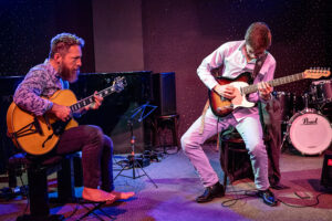 This collaboration works more than great with a set up like yesterday, established virtuoso and rising star virtuoso. Where Angelo, with his youthful energy and enthusiasm, his brilliant technique and very fast fingers, sometimes gets carried away because this is his world, and gives us some solos that would make many accomplished guitarists green with envy. Libor, our jazz ambassador in the world, gives the space to this young guitar wonderboy/man, maybe remembering his own youth?, balances the concert with his experience and every once in a while demonstrates his capability, showing he is someone to be counted on.